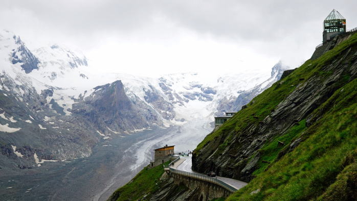 | 出発してから約3時間を過ぎた午後1時半過ぎに標高2369mのところにあるフランツ・ヨーゼフス・ヘーエ(Franz Josefs Hohe)展望台の駐車場に到着です。厚い霧は取れたものの、曇り空は相変わらず、オーストリア最高峰の標高3798mあるグロースグロックナー(Großglockner)を望むことはできそうにもありません。レストランで遅めの昼食をとった後に観光です。 | |||||
