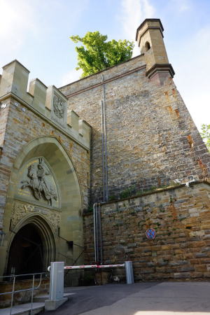 | 漸くゲートタワーに到着です。これを潜れば城内です。 ゲートタワー手前の門扉には「KÄISER WILHEM GEDÄCHTNISKICHE BERLIN 1897 1943」とあります。調べてもこの城にカイザーウィルヘルム2世が来たようなことは出てこないし、おまけにカイザー・ヴィルヘルムは1941年に亡くなっています。何の意味があるのでしょうか |