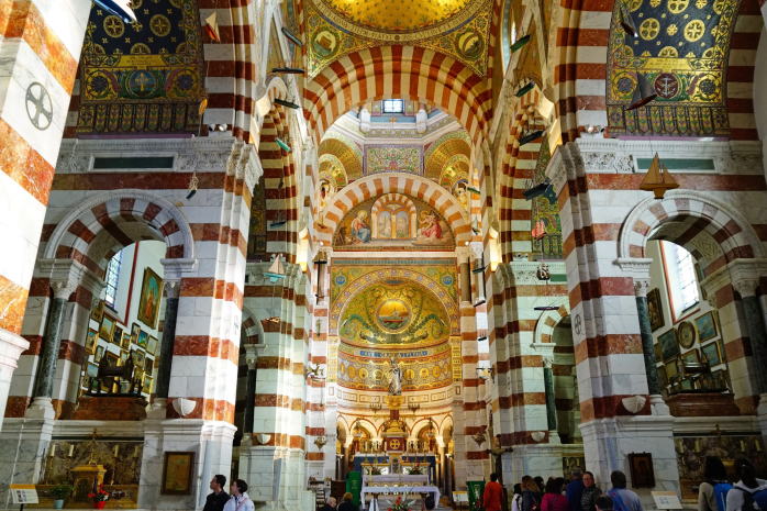 | サント・マリー・マジョール大聖堂(La cathédrale Sainte-Marie-Majeure) 旧港近くにあるこの大聖堂は、単にマルセイユ大聖堂またはマジョール大聖堂とも呼ばれており、1893年にネオビザンチン様式で創建されたものです。大聖堂の右側には12世紀ころにロマネスク様式で創建された旧大聖堂(下の写真)があります。 |