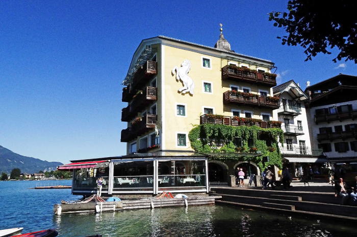 | ホテル白馬亭 オペレッタ作曲家のラルフ・ベナツキー(Ralph Benatzky)が、1930年に発表したオペレッタ「白馬亭にて」の舞台となったホテル、イム・ヴァイセン・レッスル(Im weissen Roessel)、その名にふさわしく、ホテルの名の上と庇の下、そして右側にあるレストランにも、白馬の像があります。 |