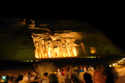 | ライトアップされた神殿 上は大神殿、下は小神殿 「音と光のショー」では、物語風にアブ・シンベルを紹介していますが、日にちによりナレーションが違い、たまたまこの日は日本語のナレーションでした。 |