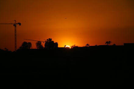 クトゥビア ジャマ・エル・フナ広場の西側にある高さ77mのミナレットです。12世紀にムーア様式のモスクの塔として建てられたものですが、現在はこの塔だけが残っています。 スペインのセビリアにある「ヒラルダの塔(高さ97m)」と並んで最も美しい塔といわれているそうです。 塔の4面はそれぞれ装飾が違うとのことですが、夕闇迫るこの時間でははっきりわかりません。 |