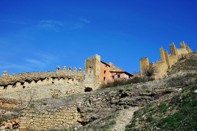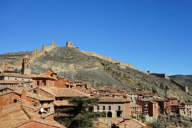 バレンシアのホテルを出発してから約2時間半、アルバラシンに到着です。 ここアルバラシンは、人口が約1000人ほどの小さな村で、標高約1200mの高地のアルバラシン山地とウニベルサレス山地の間の山の裾野にあって、村の建物は断崖の斜面に築かれて、周りをグアダラビアル川が流れています。 村の歴史は古く鉄器時代までさかのぼることができるようで、当時はケルト人が定住し、洞窟壁画を描いていた遺跡も残されています。9世紀にはベルベル人の一族アル=バヌ=ラジンが移り住みタイファと呼ばれた小王国を建国。これが現在の地名のもととなっています。村には10世紀に造られた城の城壁が残されていて赤煉瓦の家並みとが古き村の様子を伝えています。この村は時には「天空の鷲巣村」とも呼ばれ、スペインの最も美しい村のひとつにあげられていますが、訪れる観光客はまだ少ないようで、昼間でもひっそりとしたたたずまいです。 |