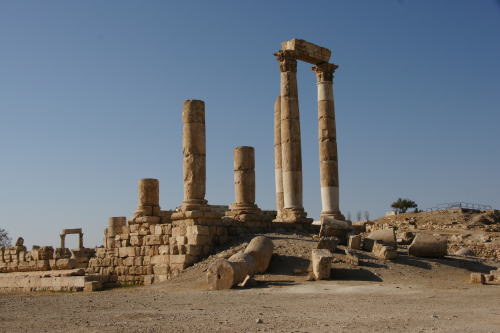 | アンマン城 空港を出てまず最初の観光が、アンマン城です。アンマン城は市街地を見下ろすジャバル・エル・カラと呼ばれる小高い山の上にあり、2世紀の初めにローマ帝国のマルクス・アウレリウス帝が建てたといわれており、城そのものは残っていませんが、ヘラクレス神殿やウマイヤ朝時代の遺跡が残っており、現在も発掘作業が行われているとのことです。山の下にはビザンチン時代のローマ劇場があります。 |