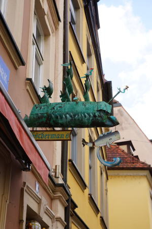 | バンベルクは「ビールの町」といわれているようで、「ラオホビア」と呼ばれる煙で燻した麦芽を用いて醸造される独特なビールが造られています。 この建物はそのビールを醸造してお店で飲ませるシュレンケラというお店ですが、建物の入口を写していないのは、入り口付近にジョッキを片手にした大勢の人がいるからです。 |
