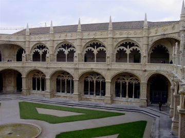 | ジェロニモス修道院(1983年世界文化遺産登録) リスボンのベレン地区にあり、位置的には発見のモニュメントのすぐそばにありますが、鉄道の線路があるため、観光バスは大きく迂回して行きます。 16世紀の初めから19世紀に至るまでの長い年月を費やして造られたとのことであり、その建設費用は多くの植民地から徴収してあてられたとのことで、大航海時代の象徴的な建物ともいえるものだそうです。中庭を取り囲む回廊にはロープや貝、花などが彫りこまれており見事です。 |