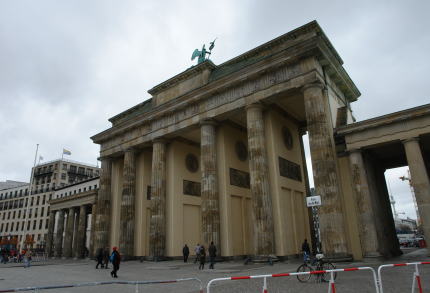 | ブランデンブルグ門 18世紀の後半にアテネの神殿を見本にしてプロイセン王国の凱旋門として建てられ、門の上には勝利の女神と4頭立ての馬車(カドリガ)があります。壁があった当時はこの門をくぐることはできなかったようです。 ここを訪れたときは、サウジアラビアの国王がドイツを訪問し、すぐそばのホテルに泊まっているとかで、厳戒態勢がしかれていました。 |