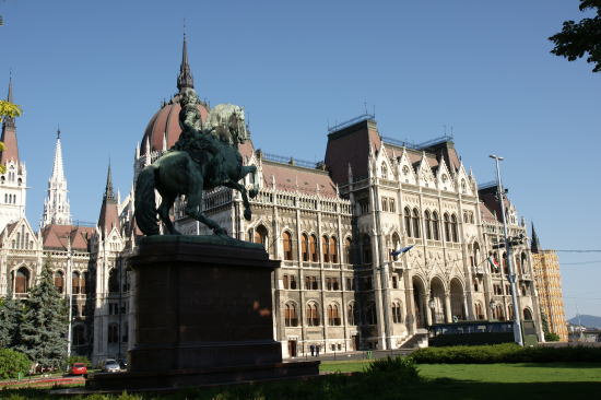 ラーコーツィ・フェレンツ2世の騎馬像と国会議事堂 トランシルヴァニア公国の君主であったラーコーツィ・フェレンツ2世は反ハプスブルク独立戦争の指導者で、ハンガリーの英雄として讃えられているとのことです。 |