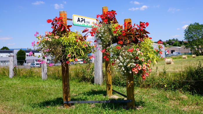 | 道端には何やら花籠と思しきものが置かれています。看板には「APIcite」と書かれており、その右には蜂の絵が描かれています。どうやら蜂蜜業者の宣伝用のようです。 |