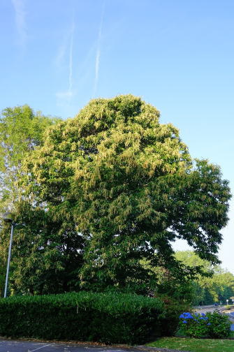 | ヨーロッパグリ(Castanea sativa) ブナ科の植物で、セイヨウグリ(西洋栗)ともいい、6月から7月に右の写真のような尾状の花序を付けます。花序は長いもので20cm近くにもなり、雌花は秋になると棘のある殻となって中に栗の実ができます。「マロン」はこの栗のことです。 |