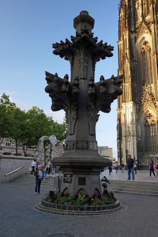 | ケルン大聖堂 ケルン旧市街のアルトシュタットにあるゴシック様式の大聖堂、正式名称はザンクト・ペーター・ウント・マリア大聖堂といい、初代の聖堂が建てられたのは4世紀といわれており、最も古い聖堂として知られており、2代目が818年に完成し、12世紀後半に東方三博士の聖遺物が置かれたことから多くの巡礼者を集めていました。2代目の聖堂は1248年に火災で焼失、直後に再建がスタートしましたが、宗教改革を発端に財政難に陥り再建は中断。本格的な再建がスタートしたのは1842年のことで、完成は再建開始から600年以上経過した1880年のことです。 大聖堂の高さは157mあり建設当時では世界最大のものでした。その後第二次世界大戦では連合軍の爆撃を受け、内部は破壊されましたが全体が崩れ落ちることはなく、復旧工事が行われて元の状態に復元されました。 この大聖堂は1996年にユネスコの世界文化遺産に登録され、一時期は周辺の高層建築物計画による景観破壊の危機にさらされ、危機遺産に指定されましたが、その後の市当局の努力によって解除されています。 (一部翌日撮影写真があります。) |
