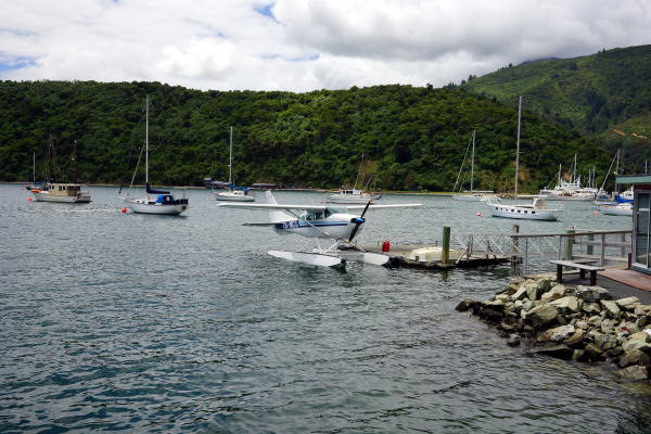 12時40分ピクトン駅に予定より30分くらい遅い到着です。駅からピクトンの船着場は歩いて数分。乗船まで船着場のデッキで写真タイムです。 駅は中央の赤い屋根のところです。 |