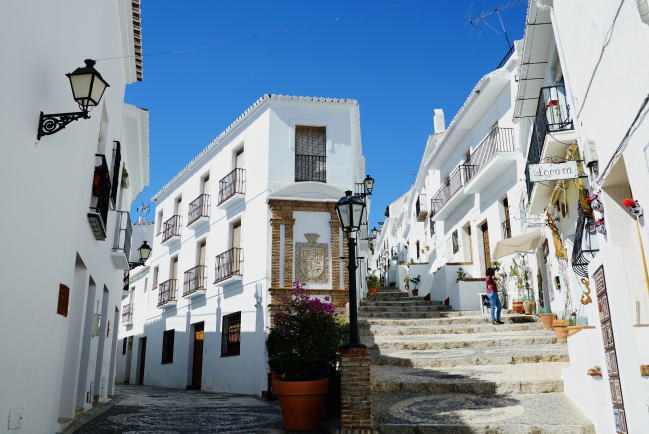 | ロルカからトイレ休憩をはさんで約4時間ちょっとで、フリヒリアナ(フリヒリアーナとも呼ばれています)に到着です。 アンダルシアの白い村のひとつで、「スペインで最も美しい村」に選ばれたことのあるフリヒリアナ、スペインのいちばん美しい村というと必ず最初に名があげられる村です。フリヒリアナは、アンダルシア州マラガ県に属していて標高320mほどの高地にあり、人口は約3000人。ムーア人がレコンキスタ以前に住んでいた歴史がある村です。 |