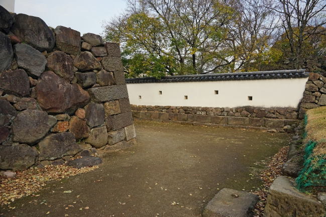 | 冠木門跡 西の丸と廊下橋の間にあった門で、櫓や楼がある門ではなく単に門柱に扉がある簡単な門でした。石垣は当時のものです。 |