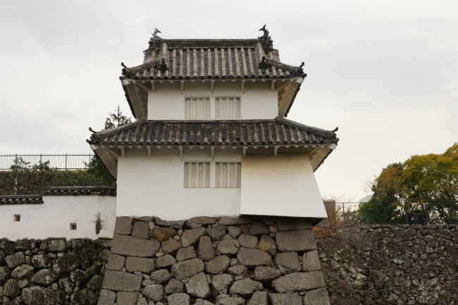 | 人質櫓 府内城は度重なる火災や地震、そして戦災により多くの建物が失われていますが、本丸跡北西隅にあるこの人質櫓は文久元(1861)年に再建された二重櫓で、宗門櫓とともに江戸時代に建てられたものです。 |