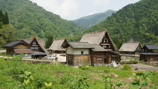 | 世界遺産五箇山の菅沼集落 東海北陸自動車道の五箇山インターを降りて数分のところにある五箇山の菅沼集落、険しい山の間を流れる庄川の河岸段丘にわずか八戸の合掌造りの建物で集落を作っています。その昔倶利伽羅峠の戦いで木曽義仲に敗れた平家の落人部落であったともいわれており、江戸時代に入ってからは加賀藩の流刑地として使用されていたようです。五箇山にはこの菅沼集落と相倉集落があり、庄川の上流、岐阜県の白川郷と併せて平成7年(1995年)に「白川郷・五箇山の合掌造り集落 」 として世界文化遺産に登録されています。 |