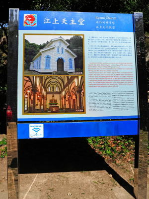 | 船着き場から歩いてすぐのところに教会があります。この教会には車で行ける道がなく、車で来ても途中から山道を歩くか、我々のように海上タクシーや漁船を利用してでしか訪れる手段がないとのこと。 左が2018年に「長崎と天草地方の潜伏キリシタン関連資産」としてユネスコの世界遺産に登録された久賀島の集落に包括されている旧五輪教会堂で、右端が新五輪教会堂です。 海外旅行していろいろ教会を見ましたが、このように海岸沿いにある教会は初めてです。 |