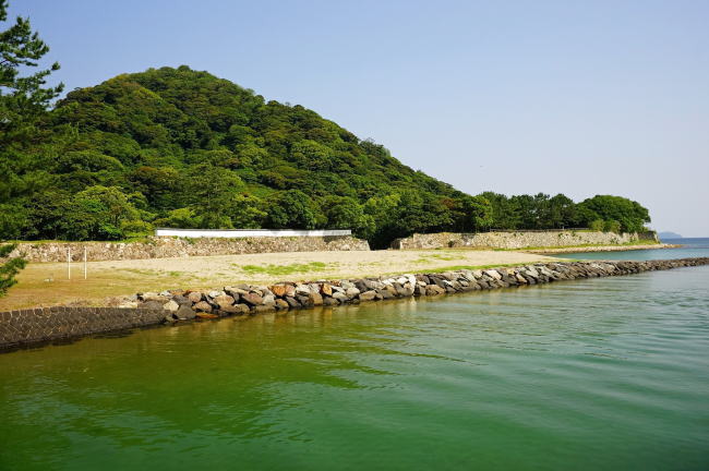 手前は橋本川の水を迂回させて造られた萩疎水(指月川)、奥の指月山の麓には二の丸の潮入門と復元された銃眼土塀があります。 | ||||||||||||||||||||||||||||||||||||