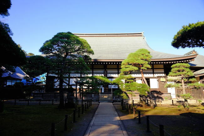 本堂 慶応3年(1867)12月の火災により庫裏とともに焼失したこの本堂は明治13年(1880年)に再建されたものです。 境内は入口にあたる総門からこの本堂まで一直線に配置されています。 |