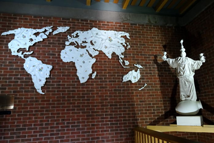 | 工房の入口には磁器で造られた世界地図が飾られています。 |