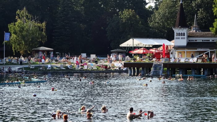| ヘーヴィーズ(Hévízi) 「温泉大国」ともいわれるハンガリーおいては各地に温泉がありますが、ここヘーヴィーズもホテルの近くにあるヘーヴィーズ湖が、「ハンガリーの温泉湖」として紹介されることが多く、泊り客だけでなく温泉目当てで訪れる観光客が少なくありません。 ヘーヴィーズ湖は大きさが47,000㎡(北海道の能取湖より少し小さい大きさです。)あって、湖全体がアルカリ性の温泉とのことで、その水温は真冬で26℃前後ある不凍湖ですが、夏になっても30℃を少し上回るくらいの水温しかありません。 我々ツアー客もホテルにチェックインし、海水着とタオル(タオルは有料となりますが、温泉で借りることができます。)を持参して、早速湖に出かけることに。 我々ツアー客はツアー料金に入浴料金が入っていますが、個人で入るとなると3時間コースで2800フォリント(日本円で1200円弱)となります。 |