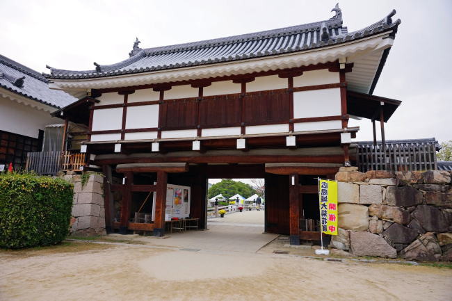 ![]() 左から再建された二の丸の表門橋(橋御門)、表御門、平櫓、多聞櫓そして太鼓櫓 |