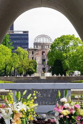 | 広島平和記念公園(2016.05.30撮影) 平和記念公園又は平和公園とも呼ばれているこの公園、広島市の大田川と元安川の合流部にある中洲に造られた公園で、第2次世界大戦末期の昭和20年(1945年)8月6日午前8時15分に、米軍のB29爆撃機『エノラ・ゲイ号』により投下された世界で最初に使用された核兵器である原子爆弾により壊滅した6町の跡地に、丹下健三氏の設計により昭和29年(1954年)に完成したものです。 |