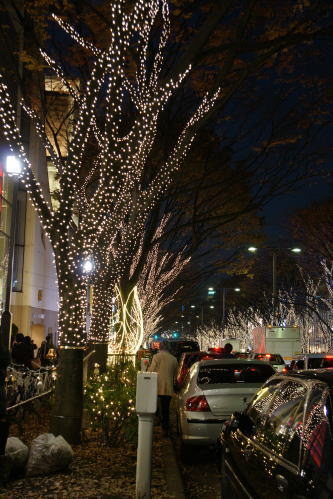 | 表参道イルミネーション(2009.12.02撮影) 11年ぶりに再開された表参道イルミネーションを見ようと4時ごろに地下鉄表参道の駅到着し、歩道橋の上で5時からの点灯を待っていましたが、歩道橋上は点灯を待ち構える人で鈴なり状態となり、通行不能のため警察から「立ち止まるな」、「歩道橋上の撮影禁止」とお触れが出る始末。やむを得ず下で撮影することに。道の両側は駐車する車で撮影環境としてはあまり良い状態ではありません。(なお、フラッシュ、三脚未使用です。) |