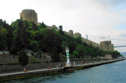| ルメリ・ヒサール オスマン・トルコ帝国のメフメット2世が、難攻不落を誇ったコンスタンチノーブルを攻め落とすために4ヶ月で築いたといわれ、幅660mというボスポラス海峡の一番狭いところにある要塞。対岸にあるアナドル・ヒサールと対峙しており、見事海上封鎖に成功してビザンチン軍は撃退されたそうです。 |