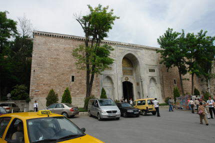 表敬の門 16世紀に増築されたというヨーロッパの城を思わせる塔があるこの門を通るときには、スルタンだけが馬に乗ったまま通れて、それ以外のものは全て歩いて入ったとのこと。 |