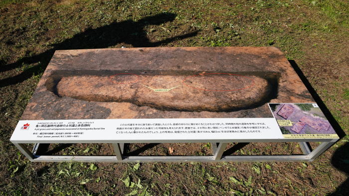 | 亀ヶ岡石器時代遺跡(2021.10.14撮影) 亀ヶ岡石器時代遺跡fは、青森県つがる市にある縄文時代晩期の集落遺跡で亀ヶ岡遺跡とも呼ばれており、縄文時代を代表する土偶の一つである「遮光器土偶」が出土した遺跡として知られていて、昭和19年(1944年)に国の史跡に指定されています。 遺跡の発見は古く、元和8年(1622年)に当時この地を治めていた津軽藩第二代藩主の津軽信枚(つがるのぶひら)が、亀ヶ岡城を築こうとした際に土偶や土器が発見されたことが判っています。(なお、亀ヶ岡城の築城は徳川幕府が一国一城令を発布したことにより中断されました。) ここの地名の「亀ヶ岡」は「甕が出土する丘」に由来するといわれています。 また、江戸時代にここから発見された土器などは「亀ヶ岡物」と呼ばれ、好事家の間で取引され、遠くオランダ迄売られたものもあるとのことで、一説では1万個を超える土器類が勝手に発掘されて持ち去られたとのことです。 |