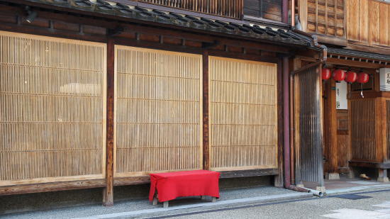 | ひがし茶屋街 金沢に3つある茶屋街の中で一番規模の大きい茶屋街で、石畳の道の両側に紅殻格子のお茶屋が並んでおり、今でも営業を行っているお茶屋さんもあるとのことで、夜になると三味線の音が聴こえそうな雰囲気があります。この街並みは重要伝統的建造物群保存地区に指定されています。 |
