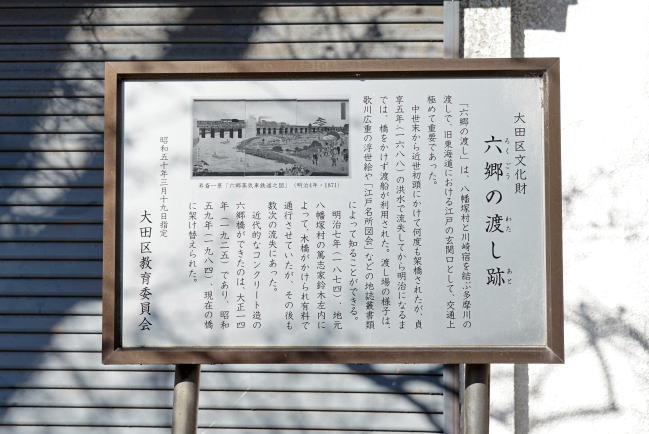 江戸名所図会・六郷の渡し 六郷橋にほど近いところにある旭町1丁目公園に置かれているのは、長谷川雪旦が描いた『江戸名所図会』の『六郷の渡し』を、後藤伸行が切り絵で表現したものと、六郷の渡しの説明文があります。 (所在地:川崎市川崎区旭町1-8-2) |