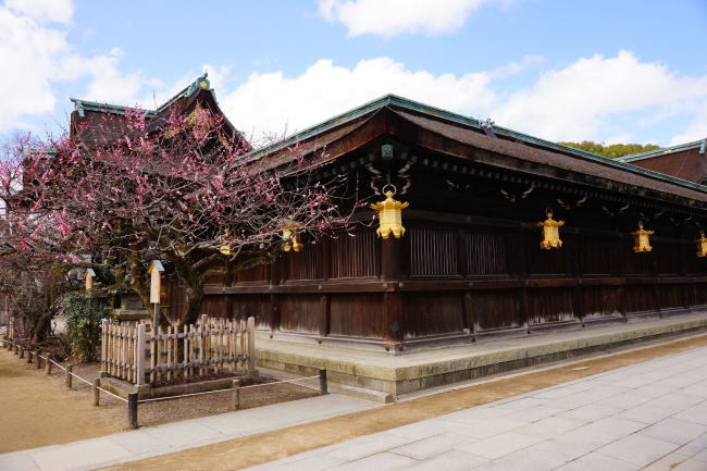 | 北野天満宮(2016.03.11撮影) 「北野の天神さん」、「天神さん」または「北野さん」として親しまれる北野天満宮は、天慶5年(942年)に右京七条に住んでいた丹治比文子に、5年後の天暦元年(947年)にも近江の国の神官の子であった太郎丸にも託宣(お告げ)があり、北野の地に朝廷によって道真を祀る社殿が造営されたのが始まりとされています。 社殿造営後の永延元年(987年)には、一条天皇より「北野天満宮天神」の称が贈られ、以後朝廷から厚い崇敬を受けることとなりました。 天満宮は、足利将軍家からも崇敬を受けていましたが、文安元年(1444年)に発生した「文案の麹騒動」で室町幕府の攻撃を受けて焼失、一時衰退したこともありますが、江戸時代には学問の神として広く信仰されるようになり、町中に多く設けられた寺子屋に分祀されていました。 明治時代には「宮」を名乗るためには祭神が皇族であり、かつ勅許が必要であることから「北野神社」と改称していましたが、第二次世界大戦後に神道国家管理を脱したあとに旧称の「北野天満宮」に戻っています。 |