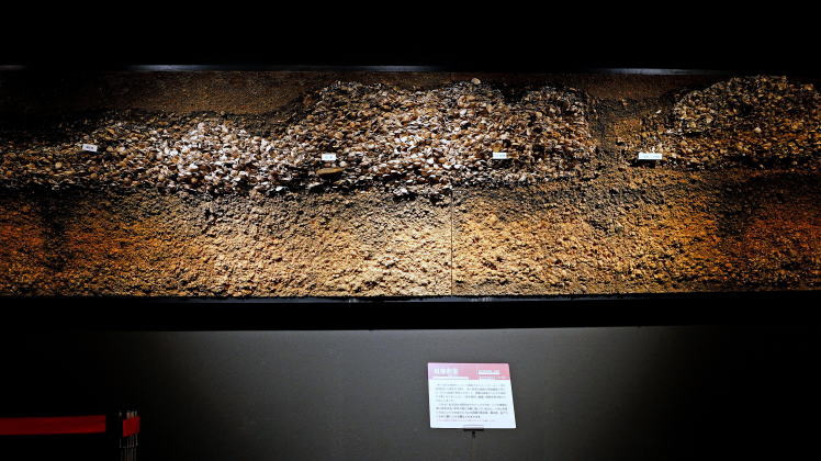 | 貝塚の断面 美々貝塚北遺跡で発見された貝塚の断面で、シジミの貝殻や鹿の骨などがあります。 |