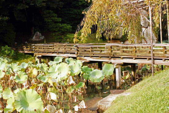 能舞台の正面にある池で夏には一天四海(通称大名蓮)と呼ばれる白い蓮の花が咲き誇ります。 池には栄唱橋という木橋が架けられています。 |