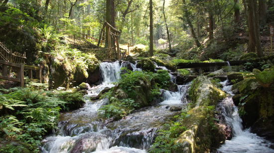 | 瓜割の滝 熊川宿から約7kmほど小浜寄りにあるこの滝、若狭町の天徳寺境内にあるわずか数メートルほどの滝ですが、一年中水温がほとんど変わらず夏でも水につけておいた瓜が割れるほど冷たいことからこの名前がついたとのことで、名水百選に選ばれていることから多くの人たちが水を汲みに来ていました。 |