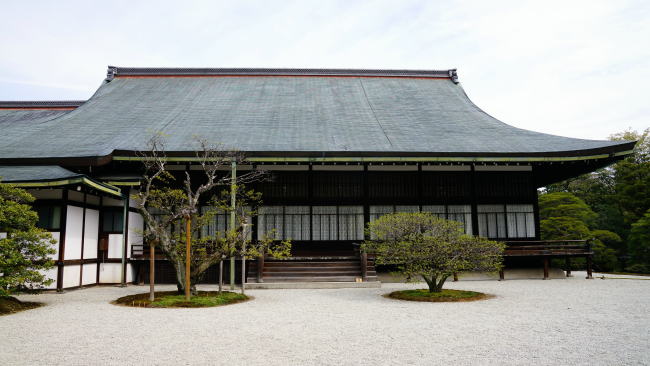 | 大宮御所の車寄せ(左)と御常御殿(右) 大宮御所は、皇太后(大宮)の御所(女院御所)のことをさしており、「京都大宮御所」とも呼ばれています。 |