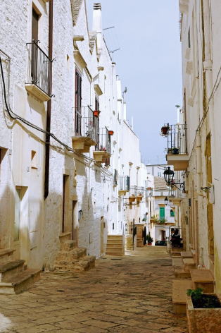| ロコロトンド アルベロベッロのホテルを出発して約15分でバスは隣町のロコロトンドに到着します。 町は標高400mほどの丘の上にあって、丸い(rotondo)場所(loco)という意味のとおり、旧市街はマードレ教会を中心に直径300m位の円形となっています。駐車場でバスを降りて約50分散策です。 |