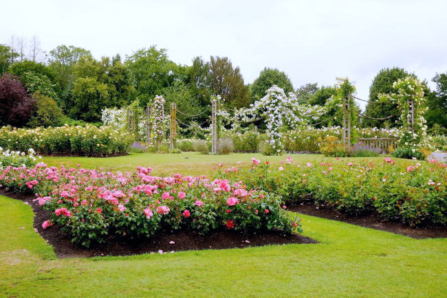 | リージェンツ・パーク ロンドン市内の北部にある王立公園で、総面積は約500エーカー(約2,000㎢)と立川の昭和記念公園が総面積は180ha(1,800㎢)ですからそその約1.2倍の広さの中に400種類、30,000本以上のバラの咲く庭園や野外劇場、スポーツ施設、学校なとがあり市民の憩いの広場となって。 朝5時から日没まで開園していて、なんと入園は無料です。(日本でもバラ園は何か所か見たことがありますがタダというところはなかったですね。) 公園の入口は数か所ありますがヨークゲートから中に入ります。 |