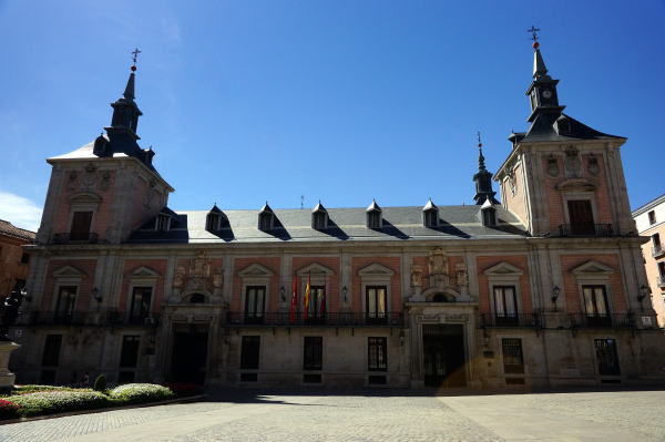 | マヨール広場 マドリード中心部にある長方形の大きな広場で、1580年にフェリペ2世が当時この地にあったアラバル広場の刷新を命じ、フェリペ3世時代の1617年に建設が始まり2年後に完成したものです。広場の周りは4階建ての建物に囲まれており中央部にはフェリペ3世の騎馬像が置かれています。 広場はマドリード最大の市場が開かれたり、闘牛やサッカーの試合、公開裁判、公開処刑なども行われていたとのことで、現在では古切手や古銭の市が開かれたり、12月にはクリスマスマーケットが開催されています。 |