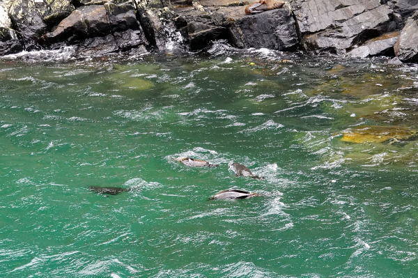 | 岩場の上には全部で20頭近いオットセイが、そのうち何頭かはツアー客へのサービスでしょうか海に飛び込み泳ぎ始めました。 | |||
