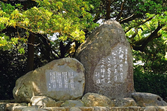 柿田川賛歌の歌碑 大分県出身で若山牧水の高弟で、沼津市の若山牧水記念館の初代館長を務めた詩人、大悟法利雄(だいごぼう としお)による「柿田川賛歌」の歌碑です。 右側の歌碑には「天地(あまつち)のゆたけき 心ここにあり この富士の山 この柿田川」と刻まれており、左側の歌碑には「太古よりこの豊けさに ここに湧く泉頭に今日も息呑む」、「若鮎とあまごの群か影なしては湧水の釜に近づく」、「日日に湧く百二十万トン この水を護りて永久に傳へさらめや」の三首が刻まれています。 |
