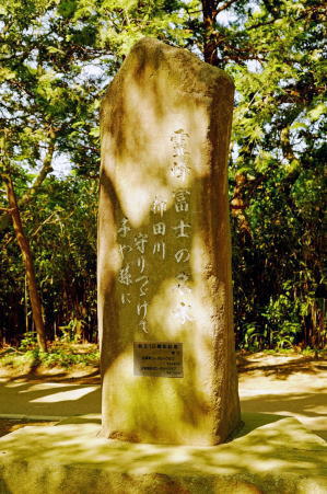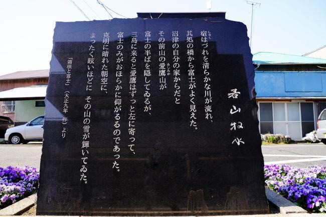 | 若山牧水の文学碑 沼津に移り住んだ若山牧水が、大正9年(1920年)に三嶋大社にお詣りしたのちに、東海道を箱根に向けて出発した時紀行文を発表したのが『静かなる旅をゆきつつ』で、碑文はこの中の上編の『箱根と富士』の一節が刻まれています。 |
