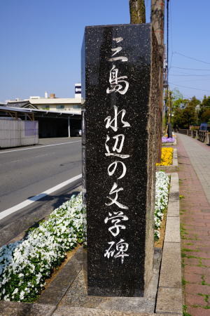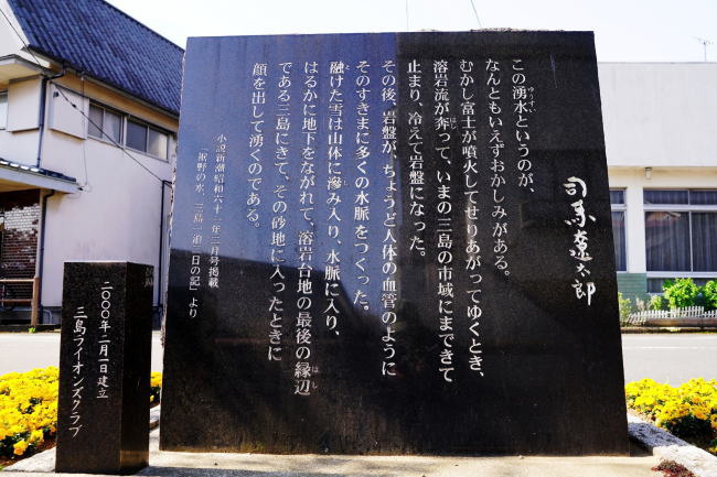 司馬遼太郎の文学碑 昭和31年(1956年)に短編小説「ペルシャの幻術師」を発表して第8回講談倶楽部賞を受賞して文壇にデビューした司馬遼太郎は、その後昭和35年(1960年)には『梟の城』で直木賞を受賞、更には昭和41年(1966年)に『竜馬がゆく』、『国盗り物語』で菊池寛賞を受賞するなど多くの作品を残した小説家です。 文学碑には、昭和61年(1966年)に小説新潮に発表した『裾野の水、三島一泊の記』の一節が刻まれています。 |