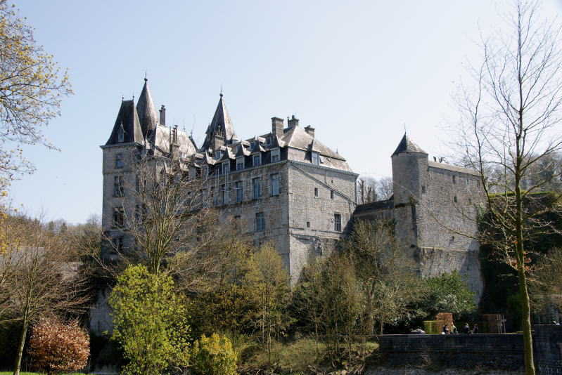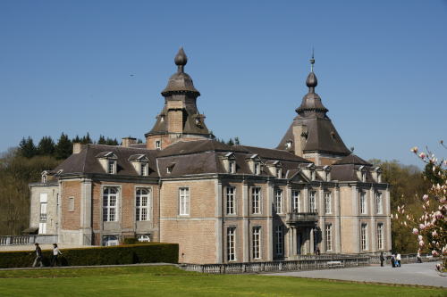 | モダーヴ ジャンヴァルを出発して1時間半でモダーヴ(モダーブ)に到着です。ベルギーには中世に立てられた古城が多く残っていて、ここモダーヴにあるモダーヴ城もそのひとつです。 この城はオユー川沿いに13世紀に一部建設が行われ、17世紀の後半に現在の姿に改装されたとのことで、ワロン地方で最も美しい城といわれているようで、ここで結婚式を挙げる日本のカップルもいるようです。 |