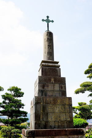 サンタ・クララ記念碑 浦上街道の大橋傍にあるこの記念碑は昭和40(1965)年に、サンタ・クララ教会跡に設けられたものです。 慶長8(1603)年に建てられたサンタ・クララ教会は、イスパニア人たちによって建てられた教会で、浦上地区では唯一つの教会でした。 教会は徳川幕府のキリシタン禁教令により破壊されましたが、教会で働いていた孫右衛門が、帳方(責任者)・水方(洗礼を授ける役)・聞役(指令伝達役)などの潜伏キリシタンの地下組織を作って信仰を固め、毎年夏には盆踊りと称して大勢の信者が集まったといわれており、約250年の間祈りの場としていました。 (所在地:長崎市大橋町1) |