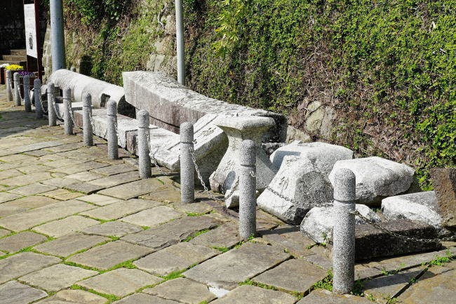 | 原爆により落下した鐘楼の一部が保存展示されています。 | 被爆当時の石垣が修復して残されています。 | ||||||||||||||
