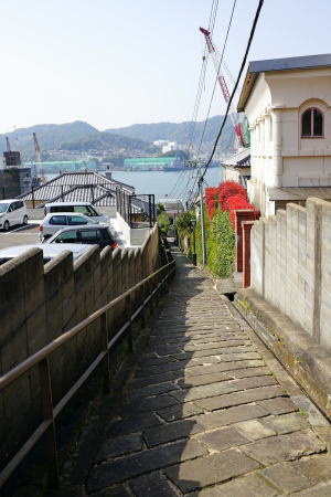 坂の上からは長崎湾が見え、対岸には世界遺産に登録されている三菱造船の第三船渠(№3ドック)が見えます。