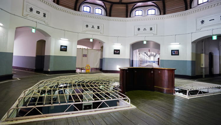 | ハビランド・システムと呼ばれる放射線状にある5棟の収容棟の中心の位置にあるのが中央監視所です。中央監視所は2階に設けられていますが、1階の天井部分が吹き抜けとなっているので、2階からも下の様子を見通せるようになっています。 |